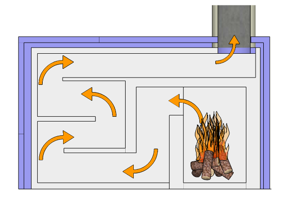 Unlike conventional cast iron wood stoves which connect the chimney directly to the fire chamber, Austrian masonry heaters have several meters of channels (commonly known as heat exchange channels or flue gas channels) separating the fire chamber and chimney connection. This separation allows for maximum efficiency by removing the highest possible amount of heat from the flue gases and storing it into the refractory material before continuing into the chimney.