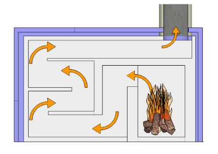 Unlike conventional cast iron wood stoves which connect the chimney directly to the fire chamber, Austrian masonry heaters have several meters of channels (commonly known as heat exchange channels or flue gas channels) separating the fire chamber and chimney connection. This separation allows for maximum efficiency by removing the highest possible amount of heat from the flue gases and storing it into the units high thermal mass before continuing into the chimney.
